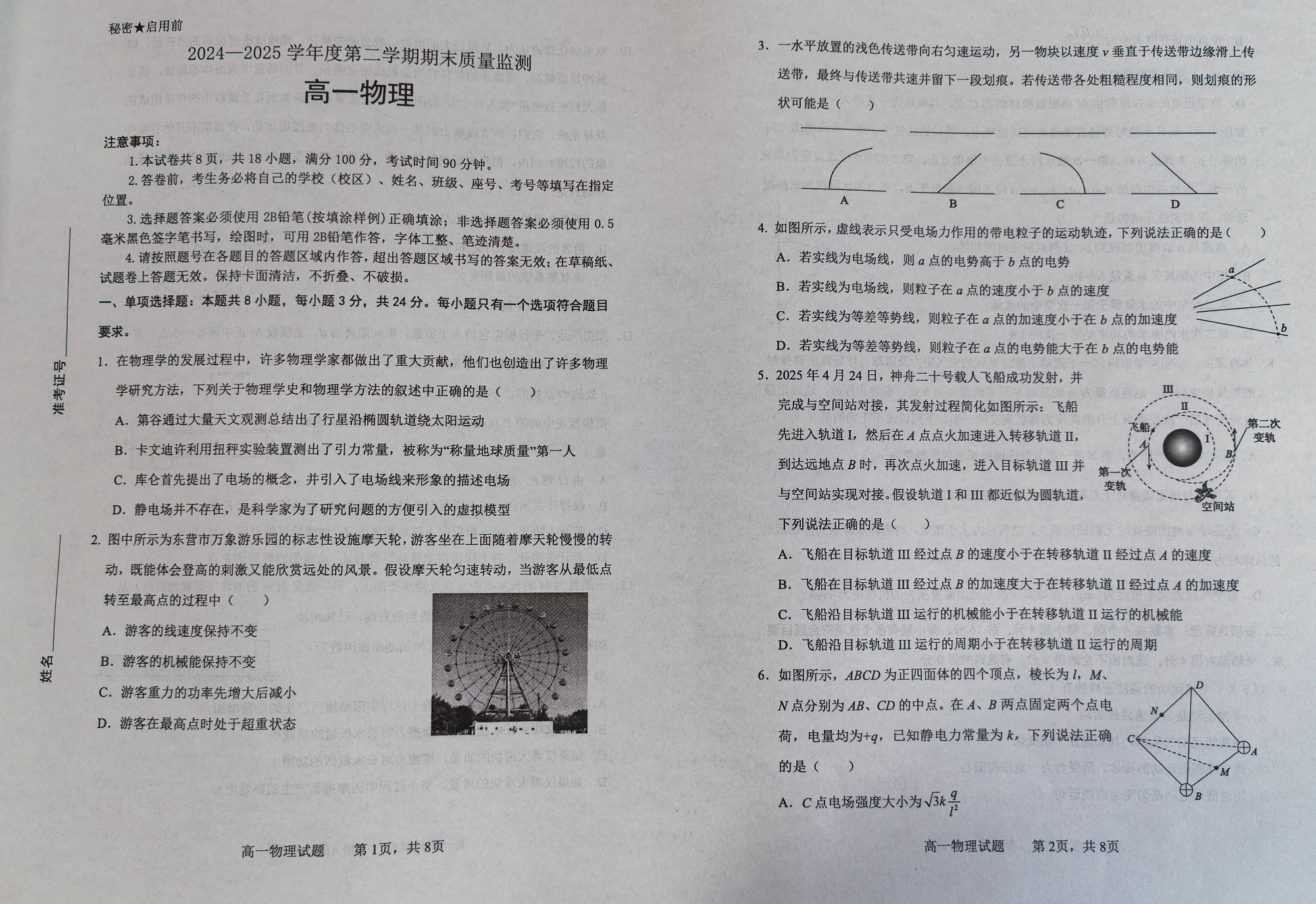 高一物理--山东省东营市2024-2025学年高一下学期期末考试