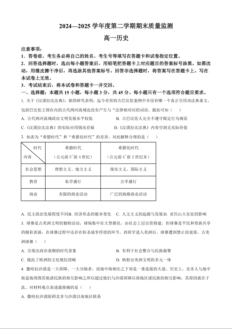 高一历史+答案--山东省东营市2024-2025学年高一下学期期末考试