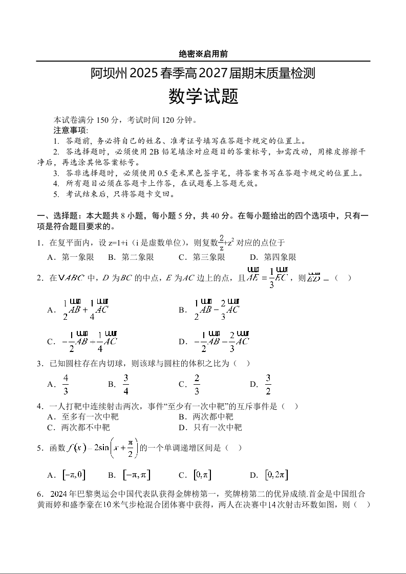 高一数学+答案--四川省阿坝藏族羌族自治州2024-2025学年高一下学期期末考试