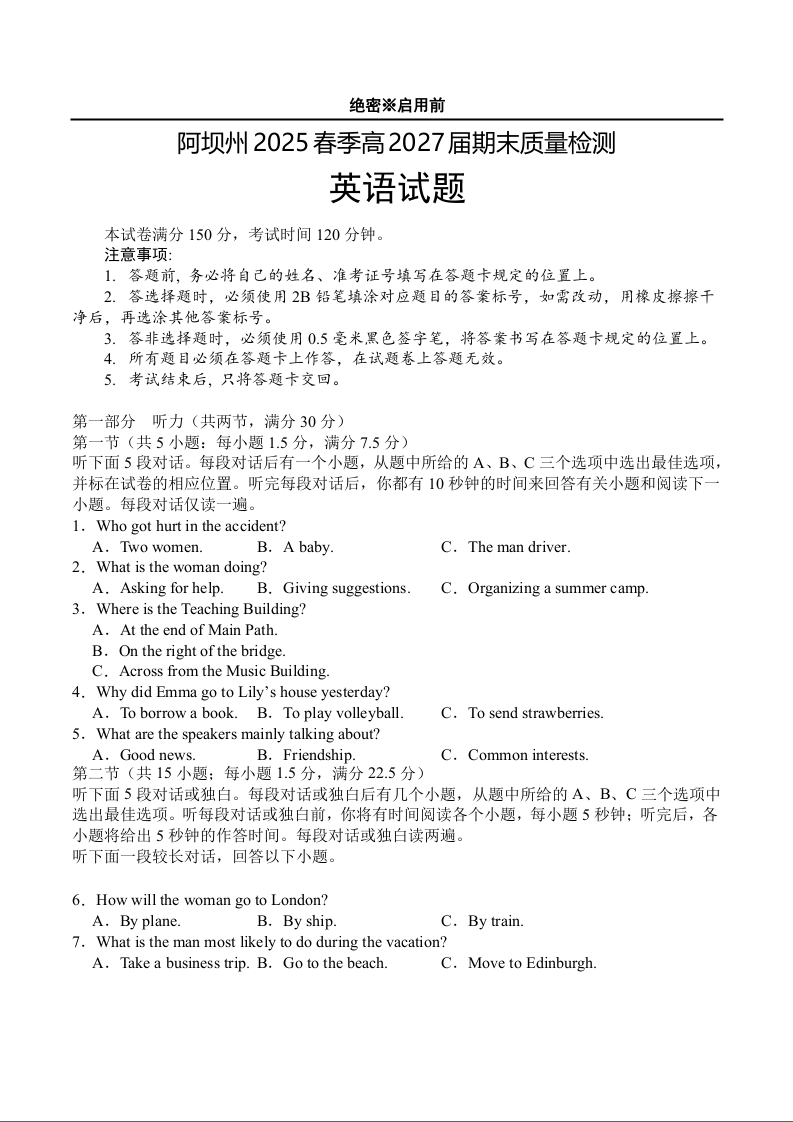 高一英语+答案--四川省阿坝藏族羌族自治州2024-2025学年高一下学期期末考试