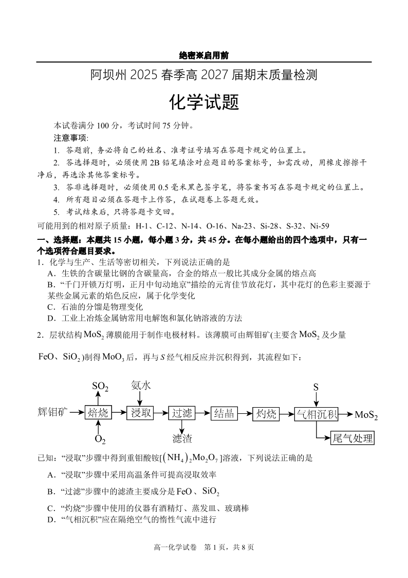 高一化学+答案--四川省阿坝藏族羌族自治州2024-2025学年高一下学期期末考试