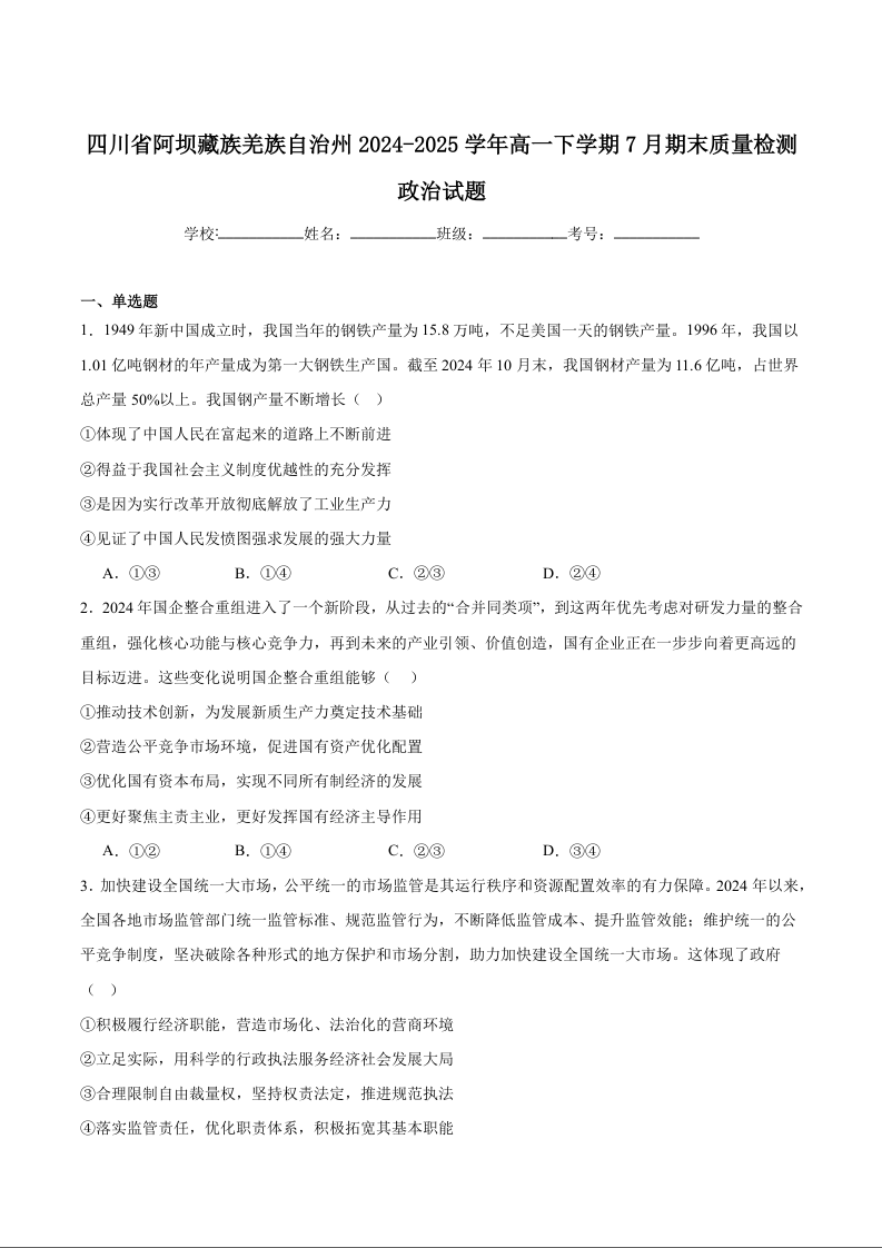 高一政治+答案--四川省阿坝藏族羌族自治州2024-2025学年高一下学期期末考试