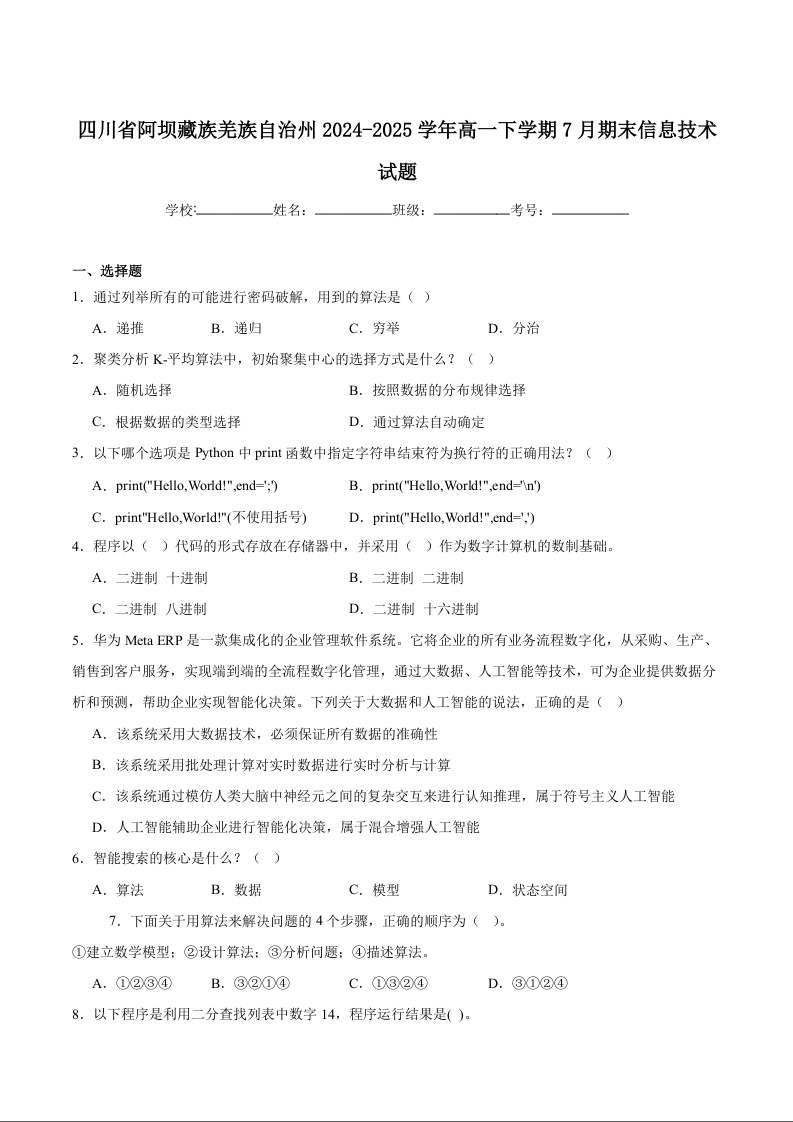 高一信息技术+答案--四川省阿坝藏族羌族自治州2024-2025学年高一下学期期末考试