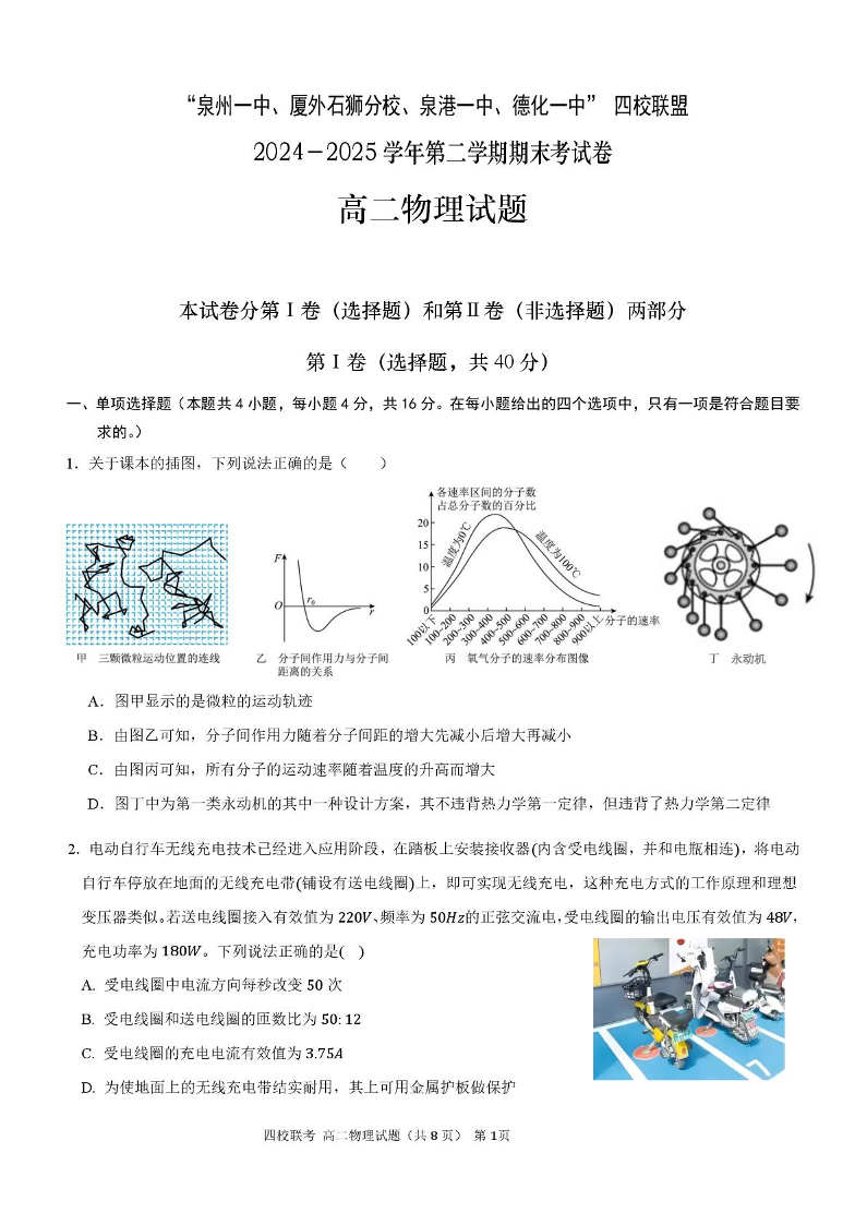 高二物理+答案--福建省泉州市四校联盟2024-2025学年高二下学期7月期末考试