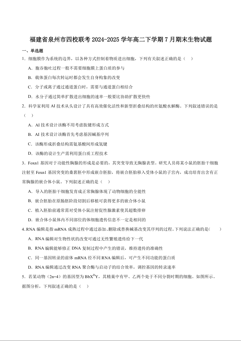 高二生物+答案--福建省泉州市四校联盟2024-2025学年高二下学期7月期末考试