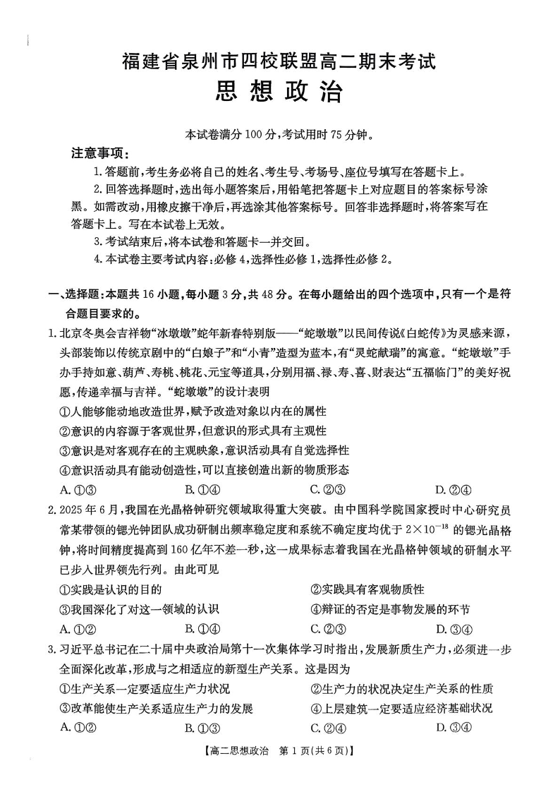高二政治+答案--福建省泉州市四校联盟2024-2025学年高二下学期7月期末考试