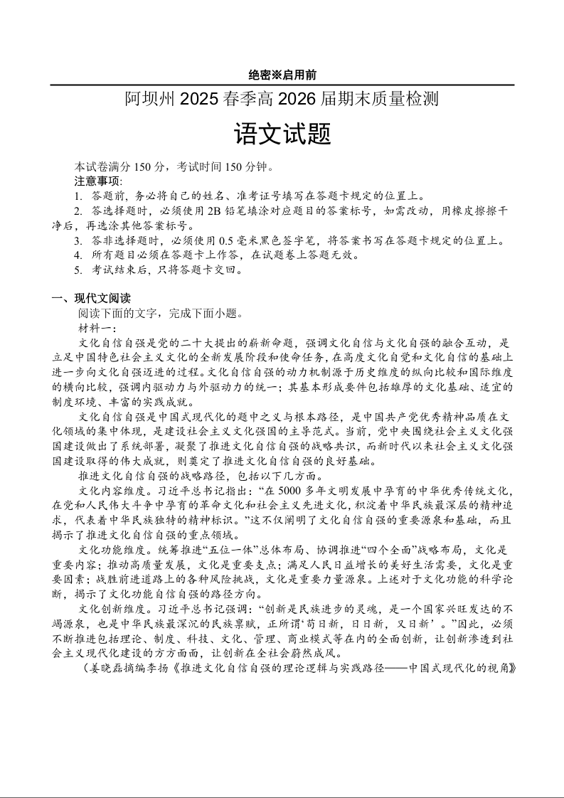 高三语文+答案--四川省阿坝藏族羌族自治州2024-2025学年高二下学期期末考试