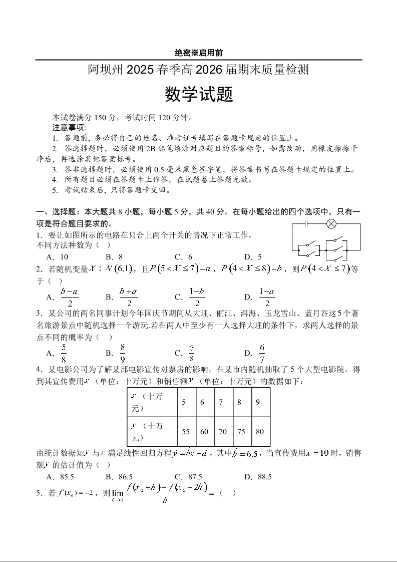 高三数学+答案--四川省阿坝藏族羌族自治州2024-2025学年高二下学期期末考试