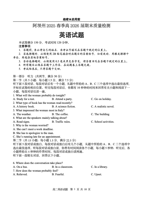 高三英语+答案--四川省阿坝藏族羌族自治州2024-2025学年高二下学期期末考试