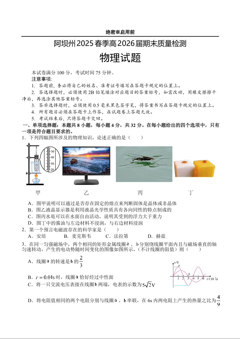 高三物理+答案--四川省阿坝藏族羌族自治州2024-2025学年高二下学期期末考试