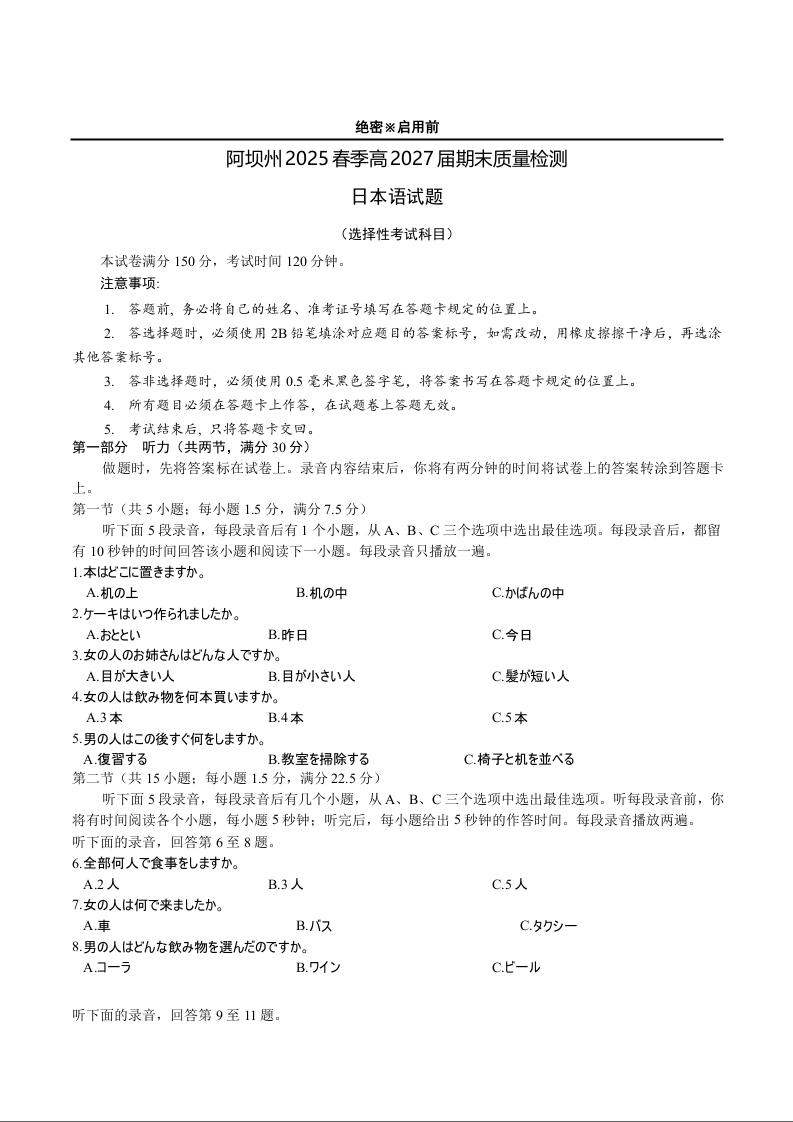 高一日语+答案--四川省阿坝藏族羌族自治州2024-2025学年高一下学期期末考试