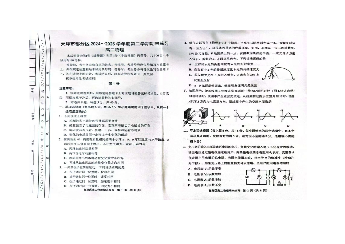 高二物理+答案--天津市部分区2026届高二下学期期末考试
