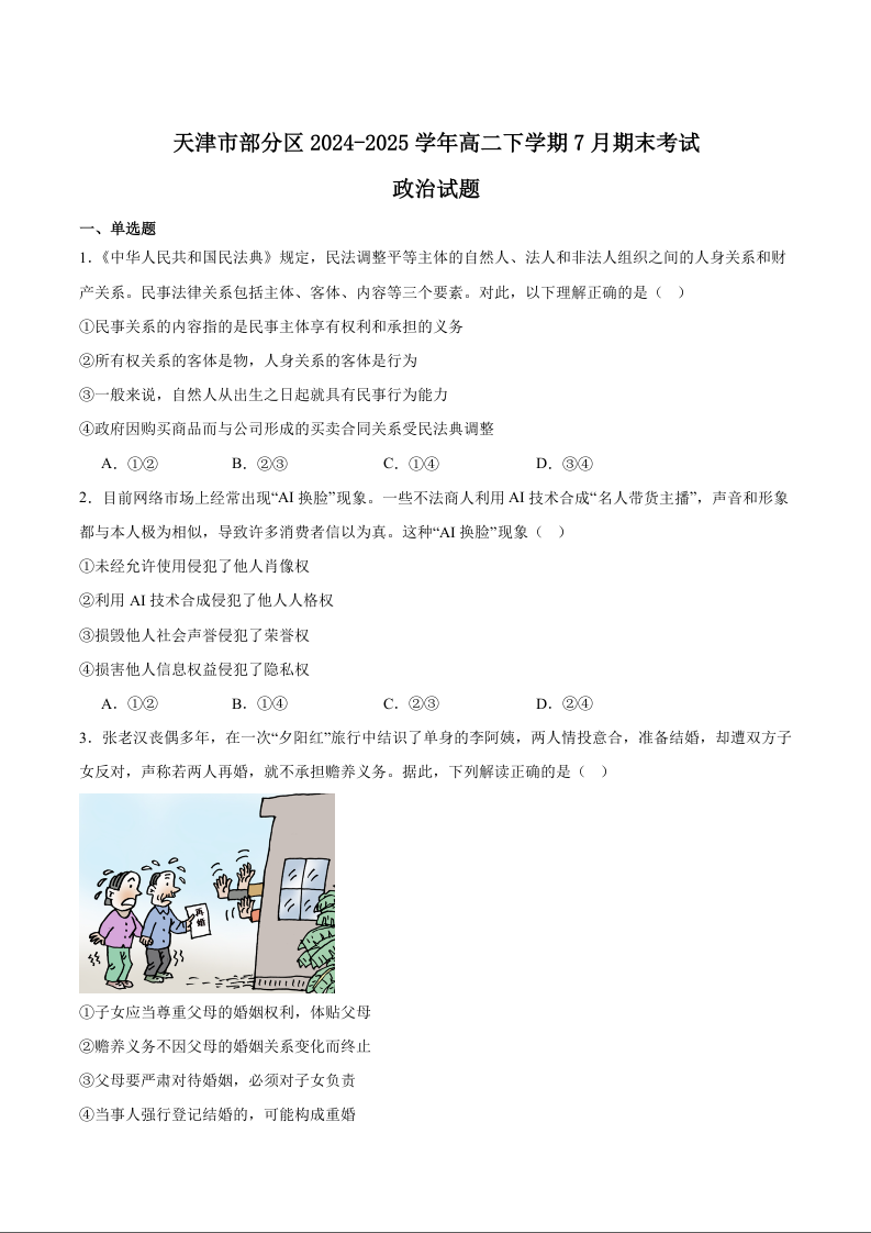 高二政治+答案--天津市部分区2026届高二下学期期末考试