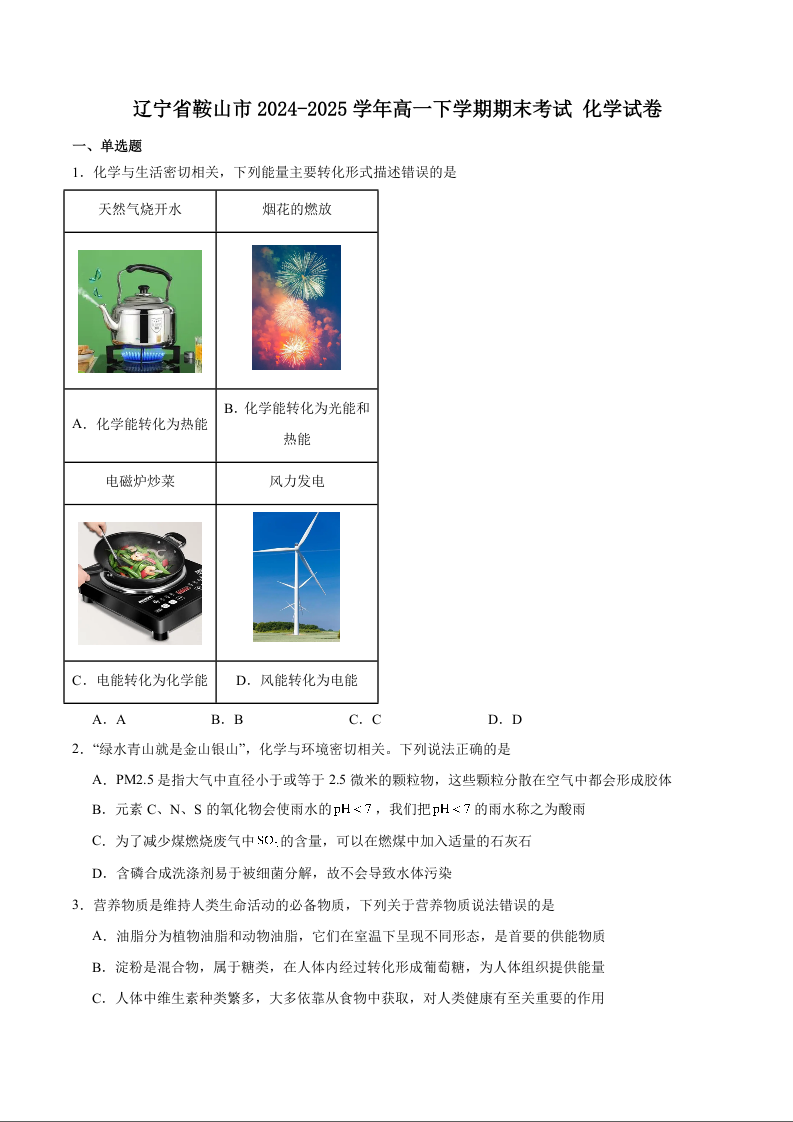 高一化学+答案--辽宁省鞍山市2024-2025学年高一下学期期末考试