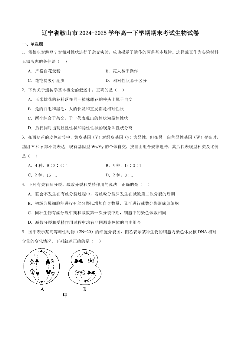 高一生物+答案--辽宁省鞍山市2024-2025学年高一下学期期末考试