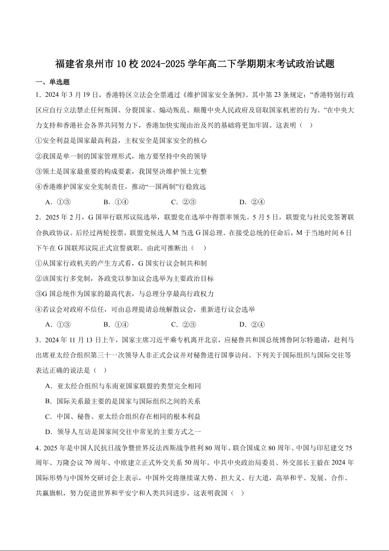 高二政治+答案--福建省泉州市十校2024-2025学年高二下学期7月期末考试