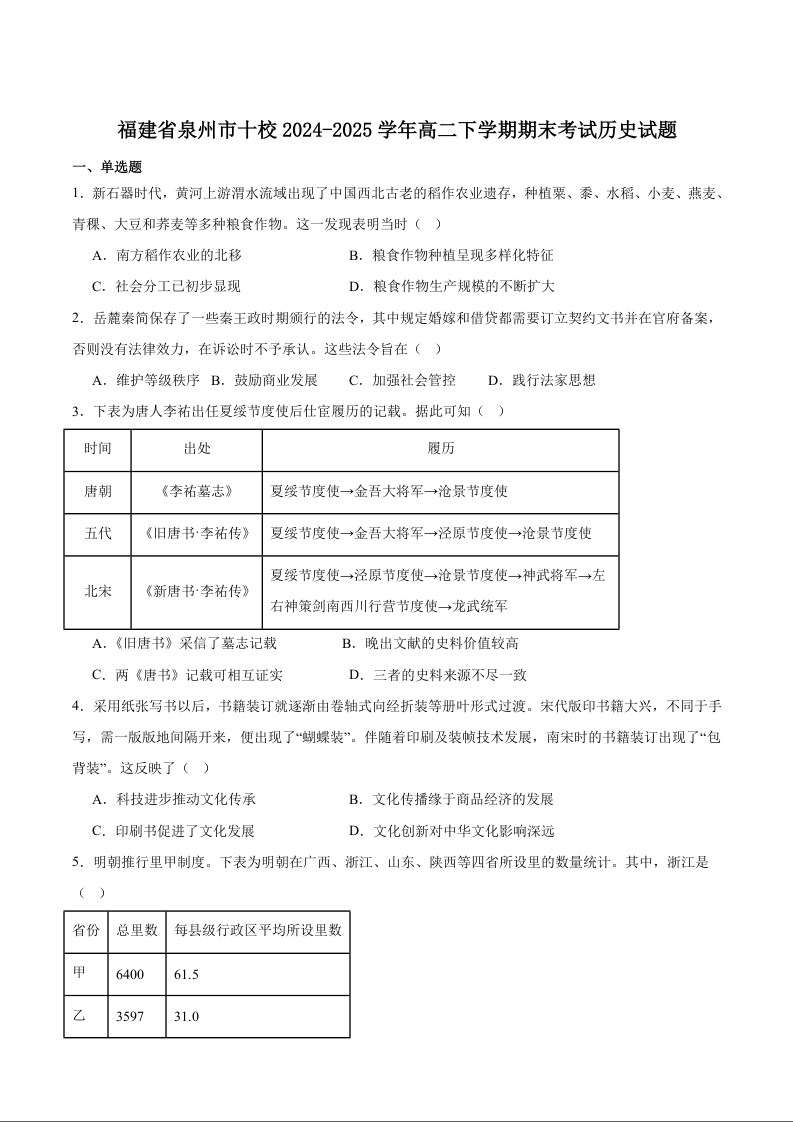 高二历史+答案--福建省泉州市十校2024-2025学年高二下学期7月期末考试