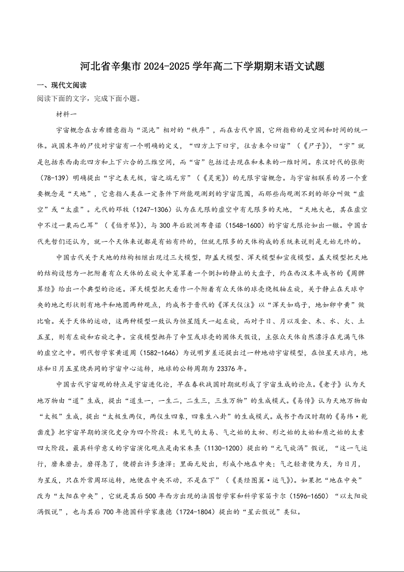 高二语文+答案--河北省石家庄市辛集市2024-2025学年高二下学期7月期末教学质量监测