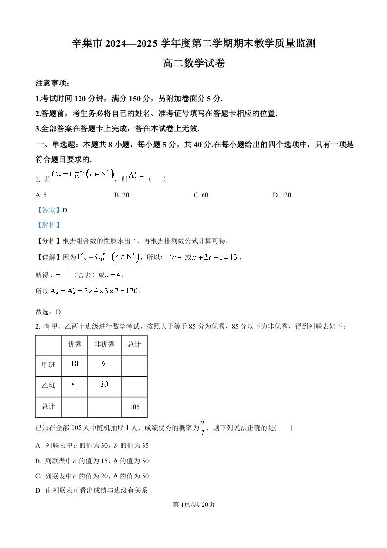 高二数学(精品解析版)--河北省石家庄市辛集市2024-2025学年高二下学期7月期末教学质量监测