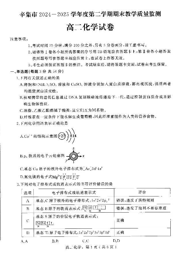 高二化学--河北省石家庄市辛集市2024-2025学年高二下学期7月期末教学质量监测