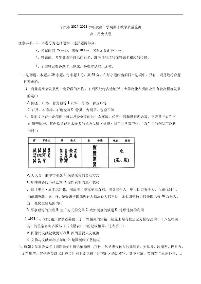 高二历史+答案--河北省石家庄市辛集市2024-2025学年高二下学期7月期末教学质量监测
