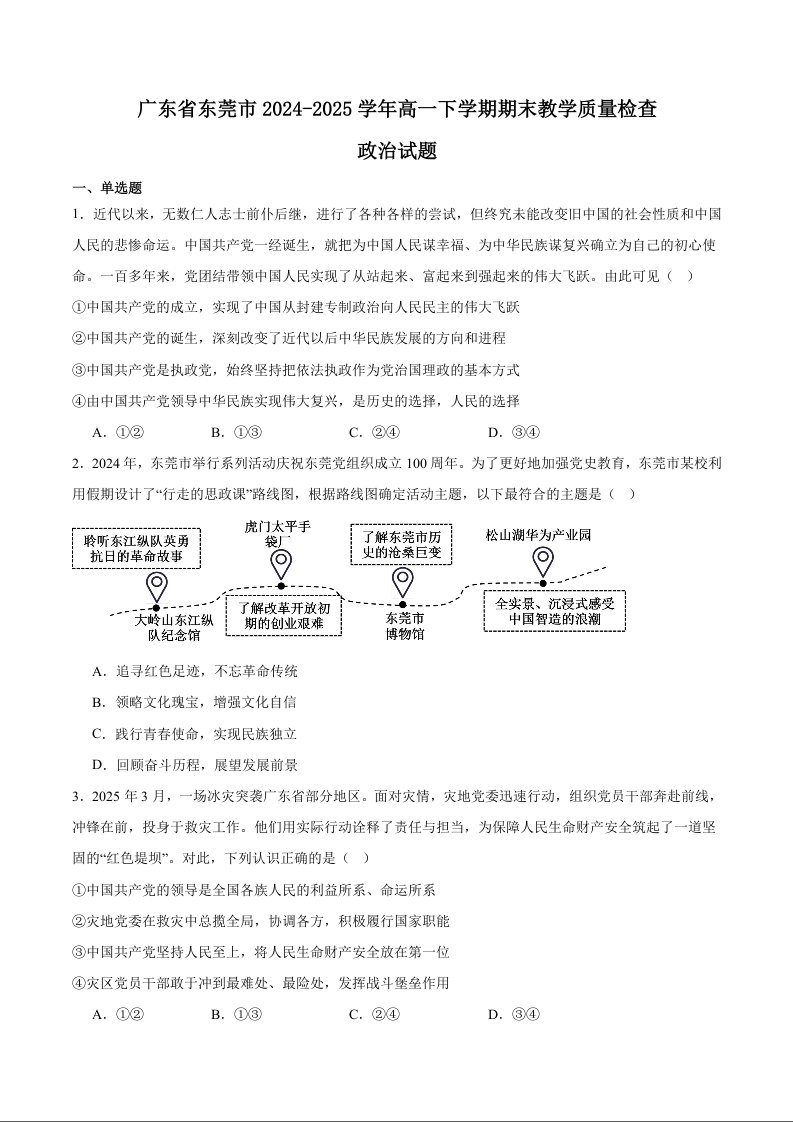 高一政治+答案--广东省东莞市2024-2025学年高一下学期期末考试