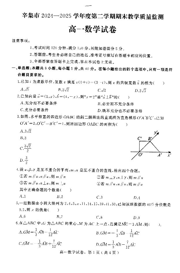 高一数学--河北省石家庄市辛集市2024-2025学年高一下学期7月期末教学质量监测