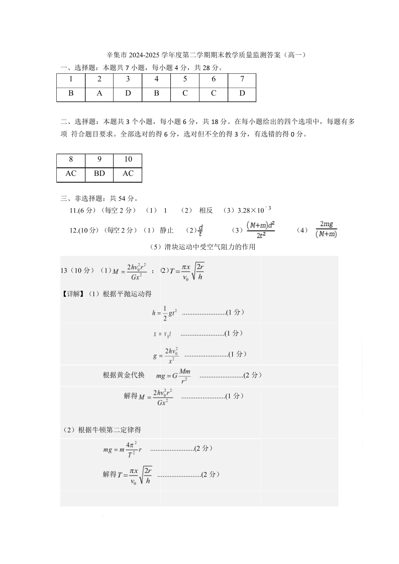 高一物理答案--河北省石家庄市辛集市2024-2025学年高一下学期7月期末教学质量监测