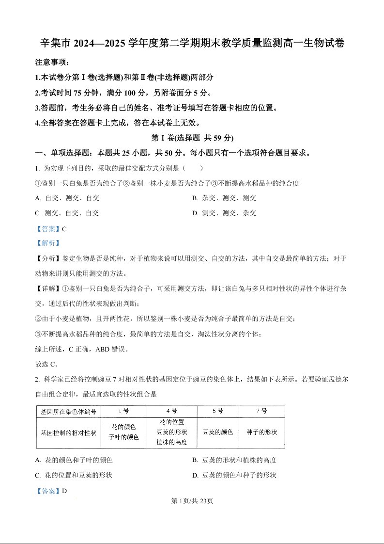 高一生物(解析版)--河北省石家庄市辛集市2024-2025学年高一下学期7月期末教学质量监测
