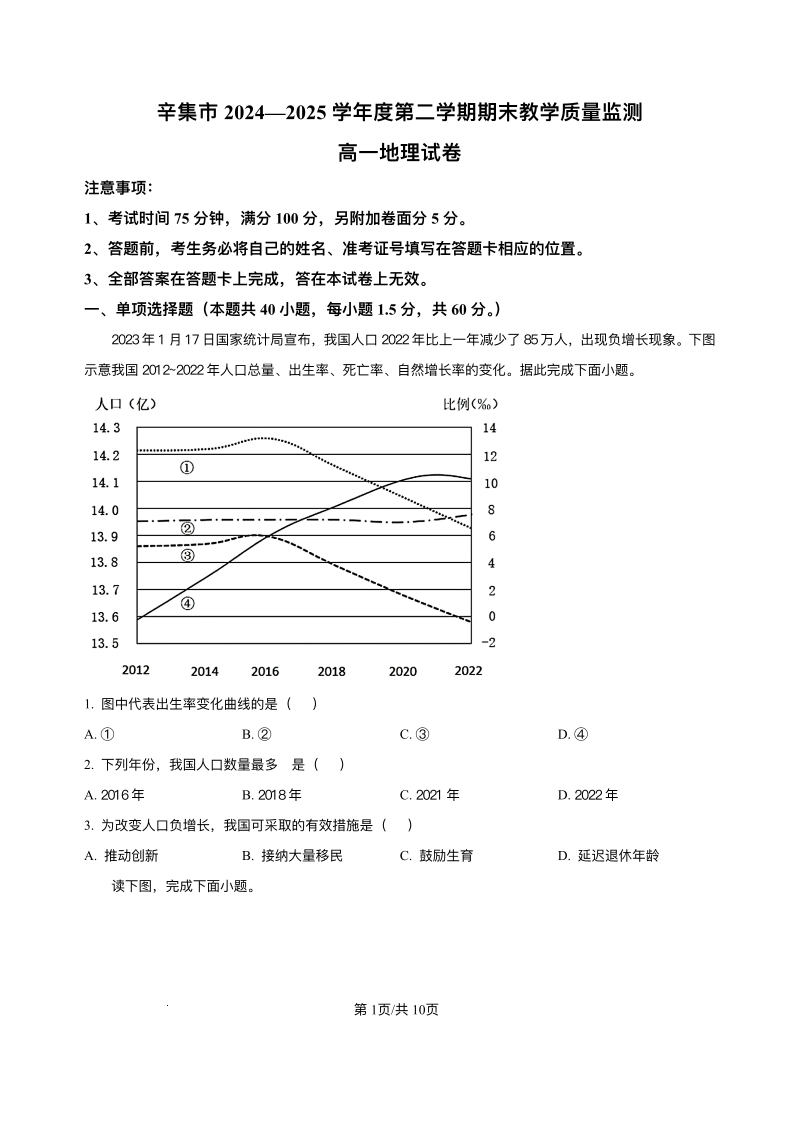 高一地理+答案--河北省石家庄市辛集市2024-2025学年高一下学期7月期末教学质量监测