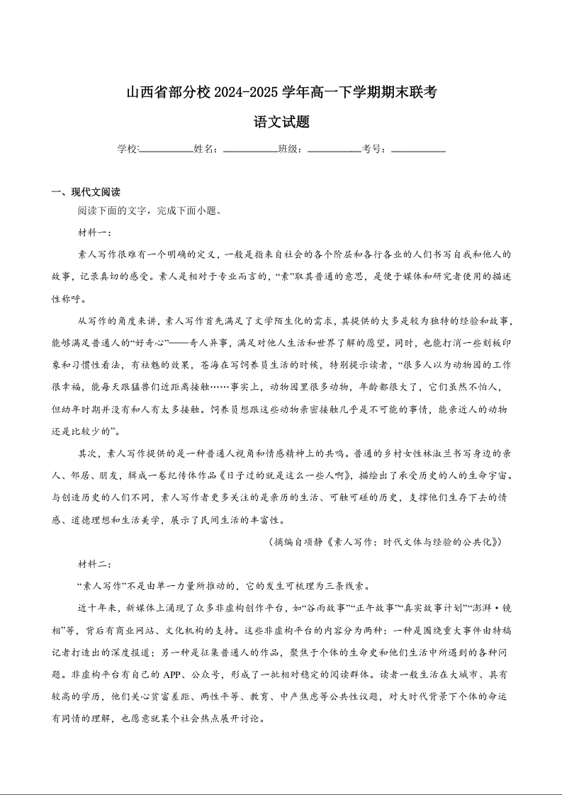 高一语文+答案--山西省临汾部分学校2024-2025学年高一下学期期末联考