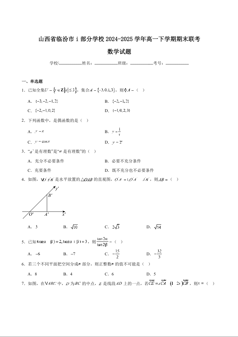 高一数学+答案--山西省临汾部分学校2024-2025学年高一下学期期末联考
