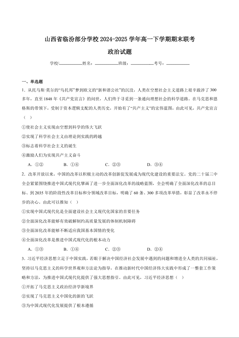 高一政治+答案--山西省临汾部分学校2024-2025学年高一下学期期末联考