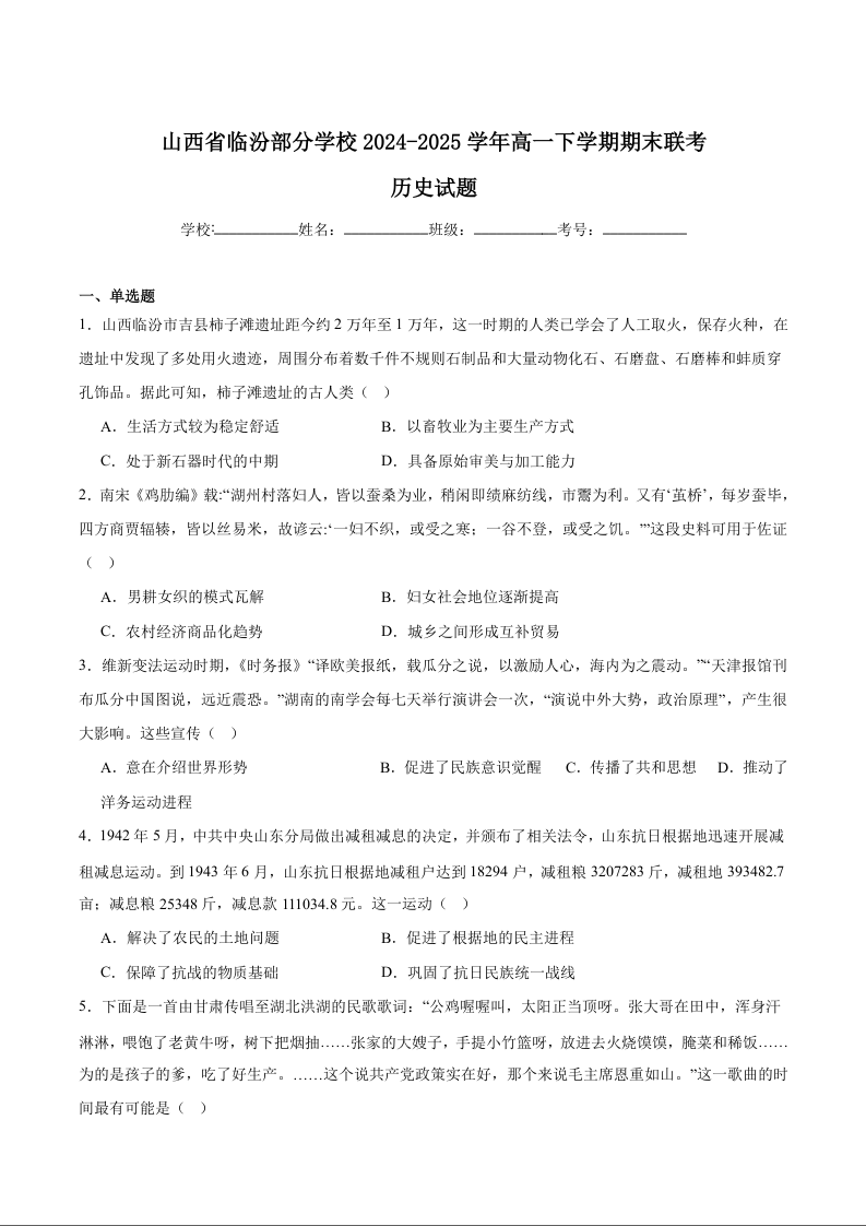 高一历史+答案--山西省临汾部分学校2024-2025学年高一下学期期末联考