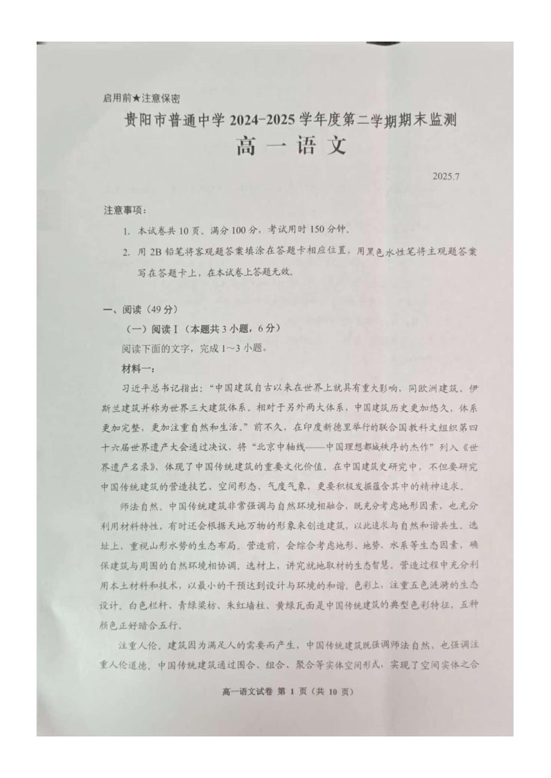 高一语文+答案--贵州省贵阳市普通高中2024-2025学年高一下学期期末考试