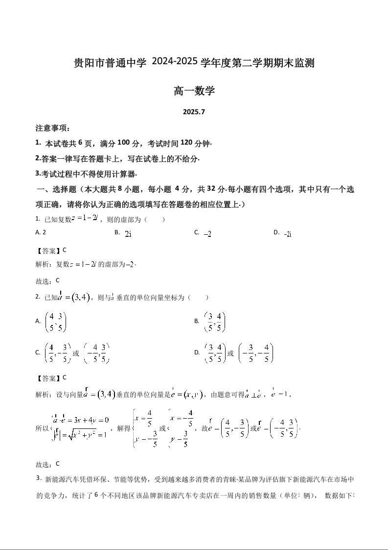 高一数学+答案--贵州省贵阳市普通高中2024-2025学年高一下学期期末考试