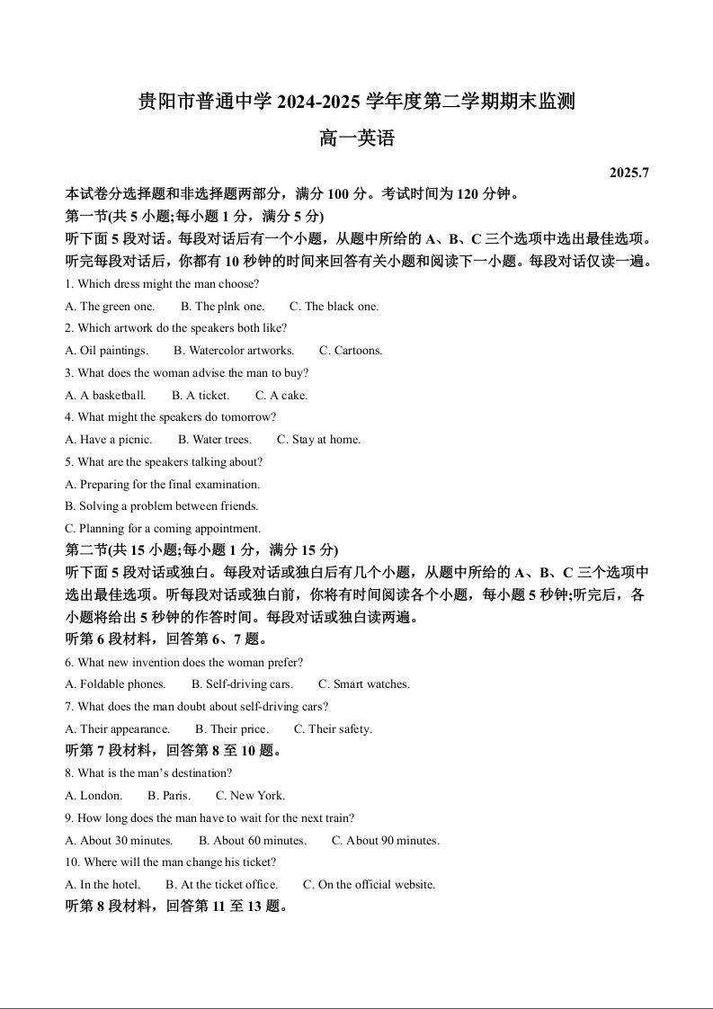 高一英语+答案--贵州省贵阳市普通高中2024-2025学年高一下学期期末考试