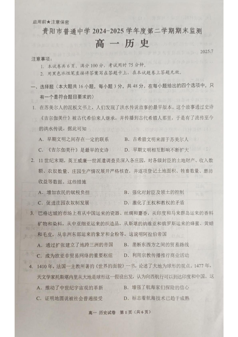 高一历史+答案--贵州省贵阳市普通高中2024-2025学年高一下学期期末考试