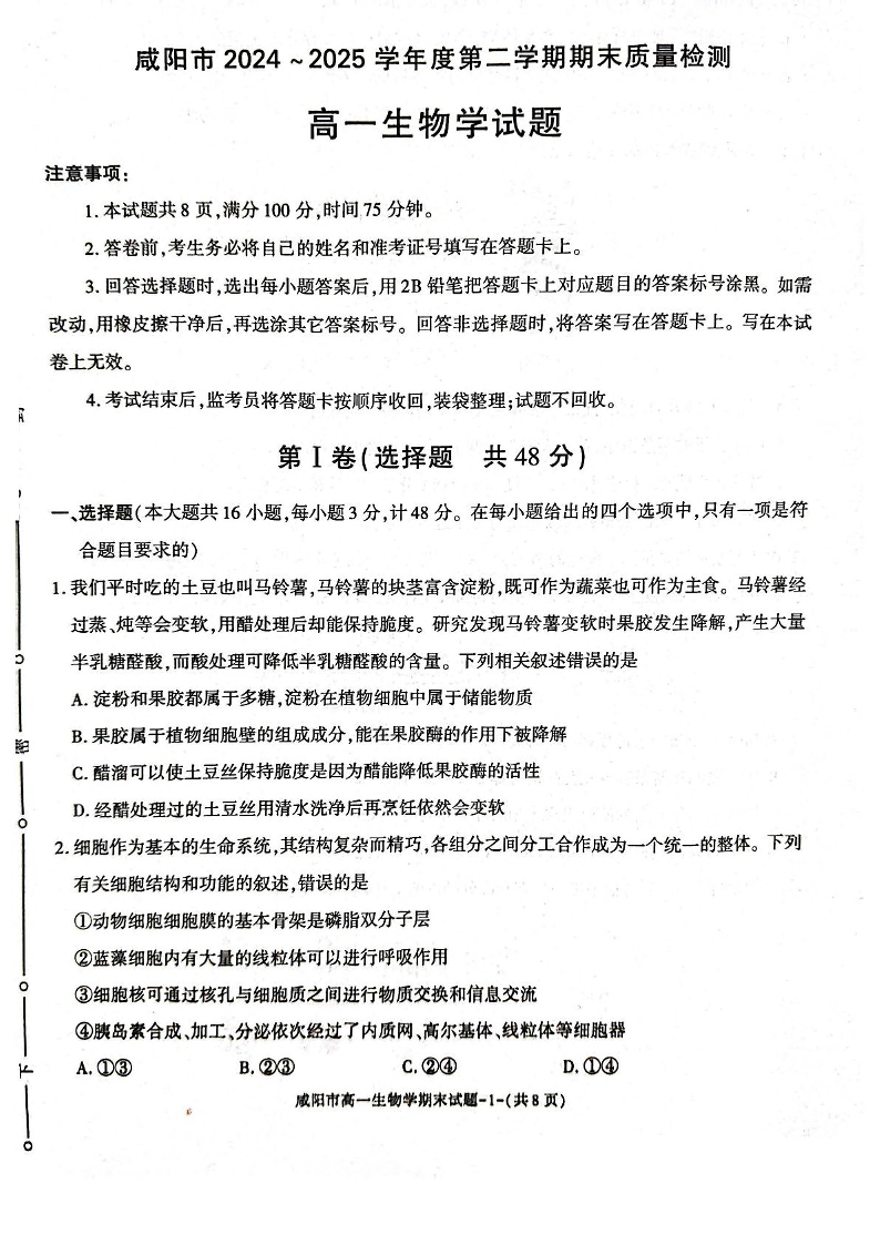高一生物+答案--陕西省咸阳市2024-2025学年高一下学期期末