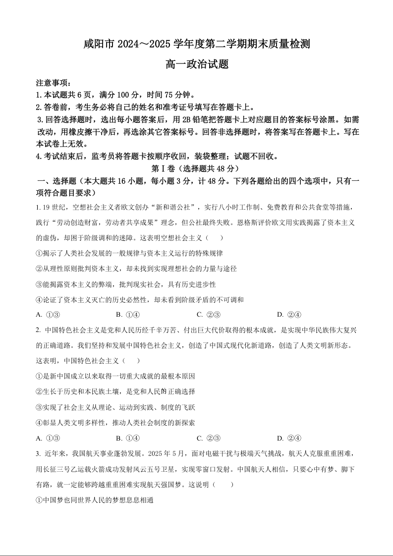 高一政治+答案--陕西省咸阳市2024-2025学年高一下学期期末
