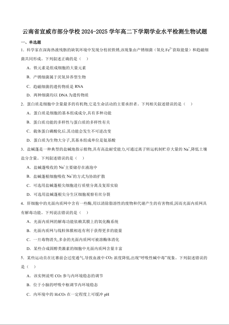 高二生物+答案--云南省曲靖市宣威市部分学校2024-2025学年高二下学期期末考试