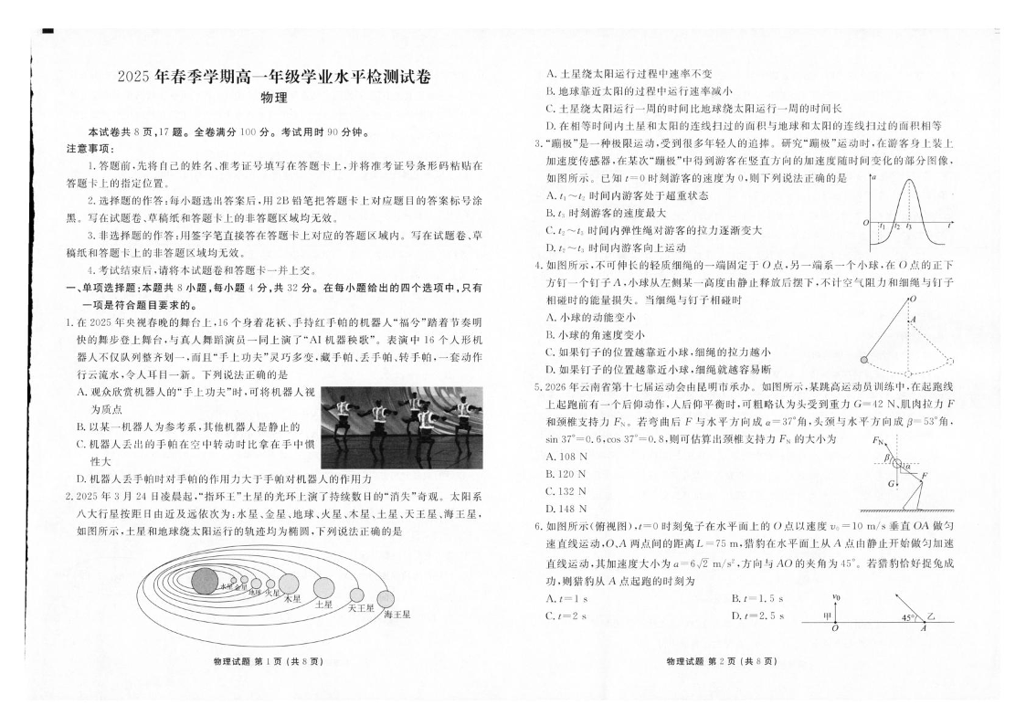 高一物理+答案--云南省曲靖市宣威市部分学校2024-2025学年高一下学期期末考试