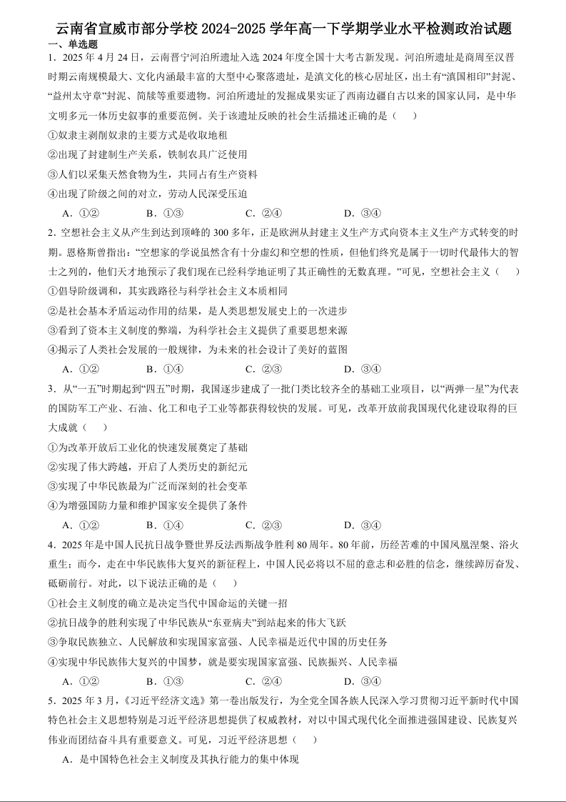 高一政治+答案--云南省曲靖市宣威市部分学校2024-2025学年高一下学期期末考试