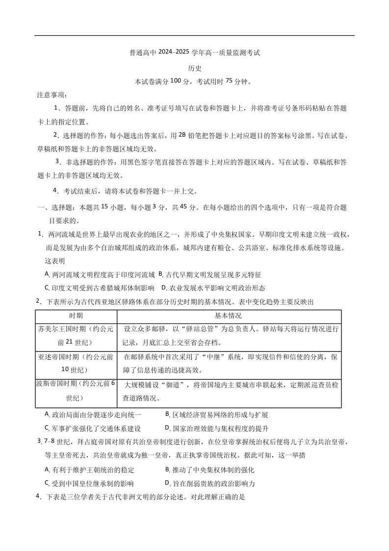 高一历史+答案--云南省曲靖市宣威市部分学校2024-2025学年高一下学期期末考试