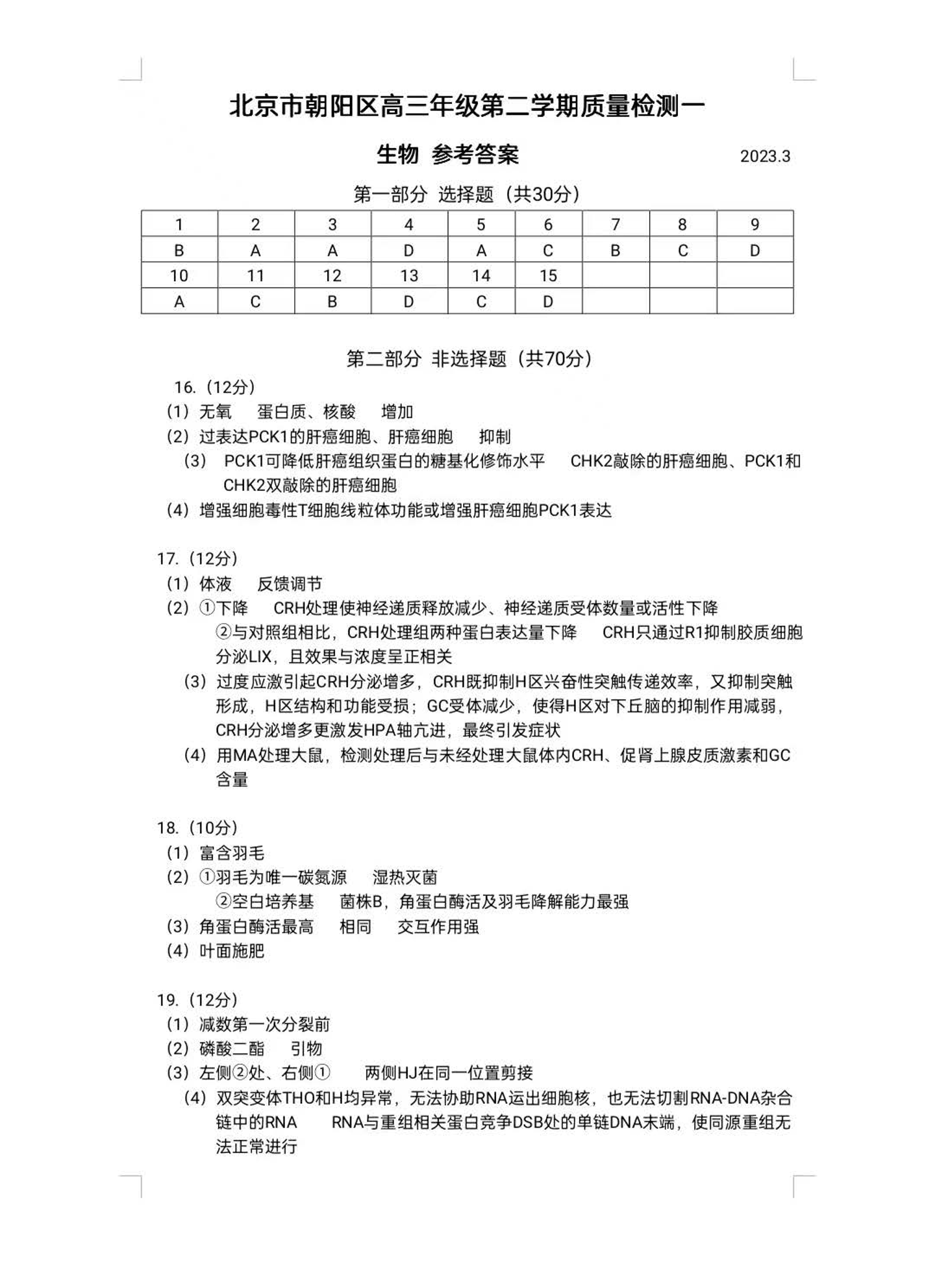 高三生物答案--北京市朝阳区2023届高三下学期一模