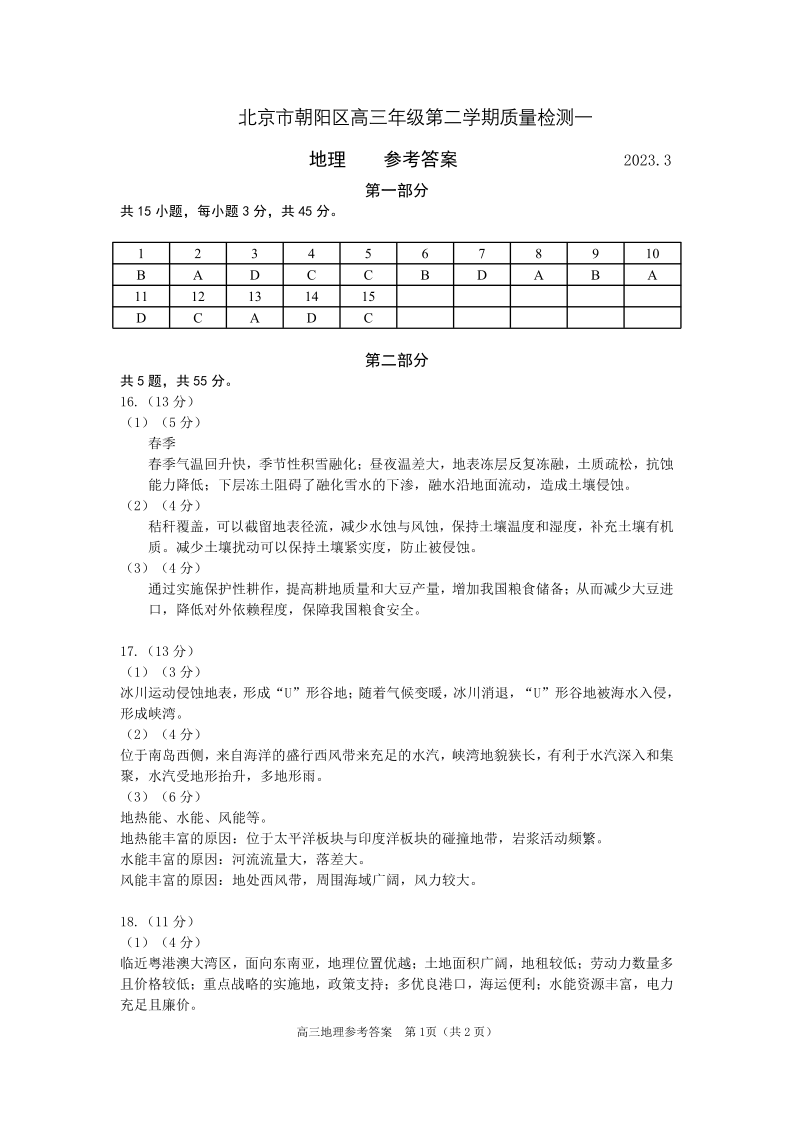 高三地理答案--北京市朝阳区2023届高三下学期一模