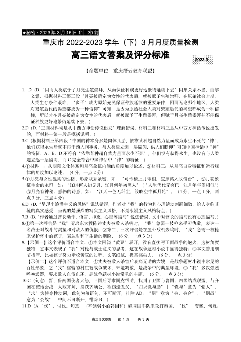 高三语文答案--重庆缙云教育联盟2023届高三3月质检