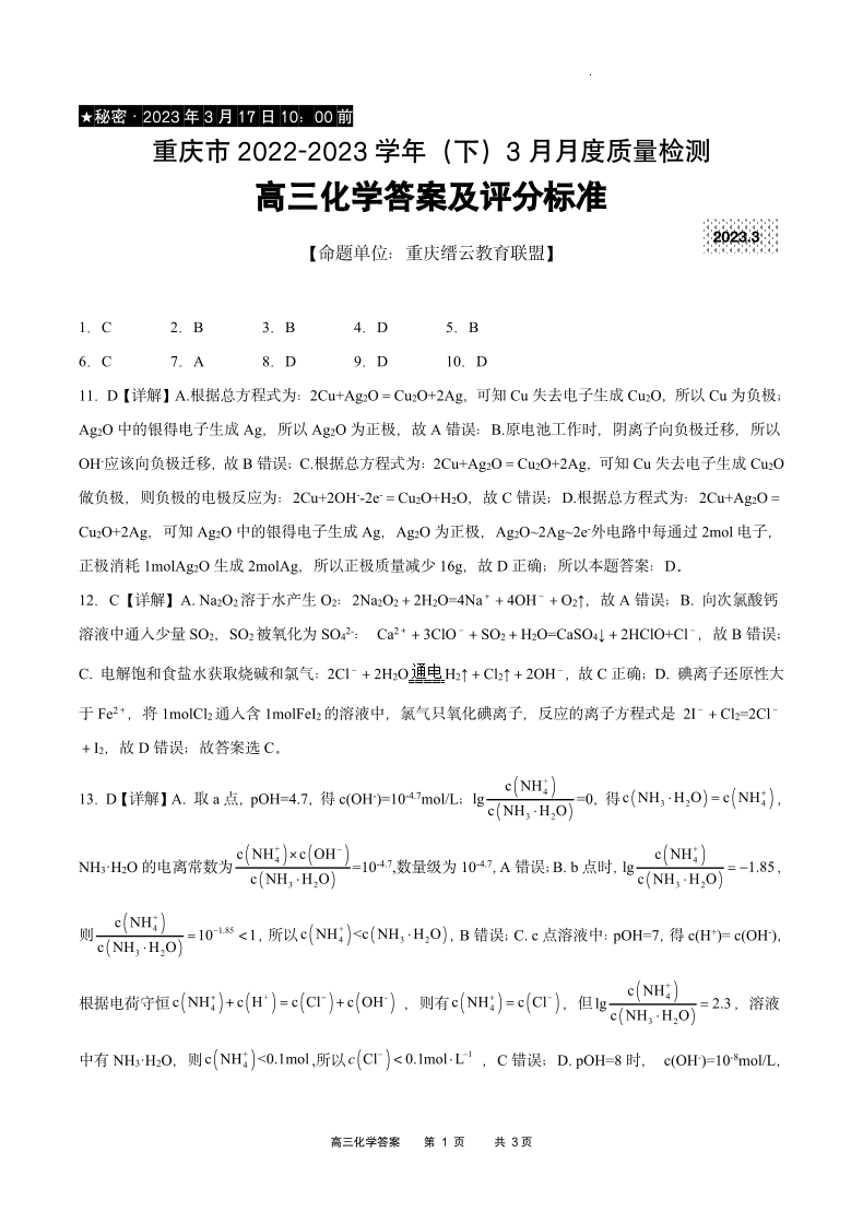 高三化学答案--重庆缙云教育联盟2023届高三3月质检