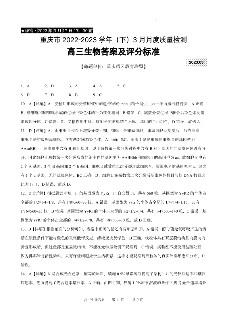 高三生物答案--重庆缙云教育联盟2023届高三3月质检