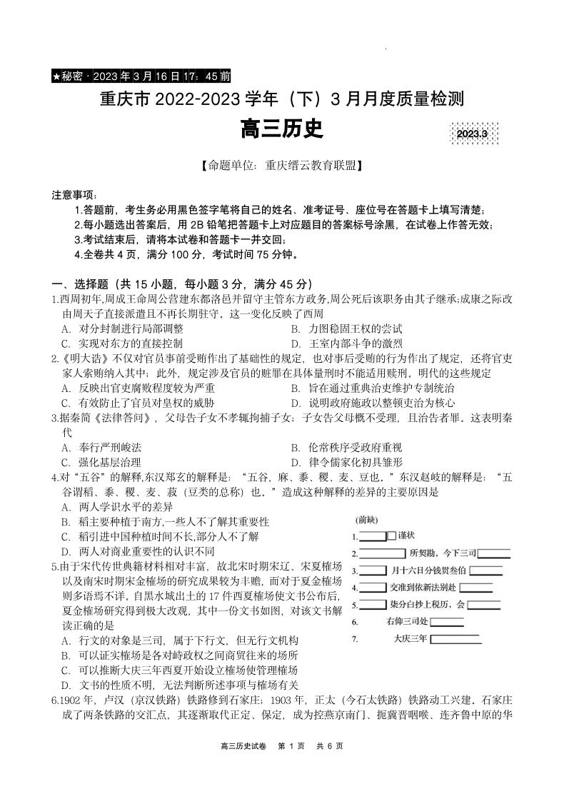 高三历史--重庆缙云教育联盟2023届高三3月质检